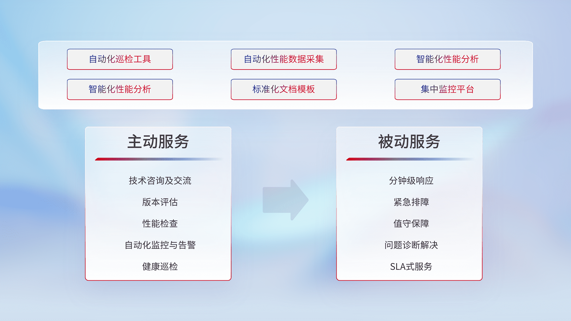 智能化工具和标准化文档,,,,保障服务质量,,,,提供主动服务(包含技术咨询、、、、版本评估、、性能检查、、、、自动化监控与告警、、、健康巡检)和被动服务包含(分钟级响应、、、紧急排障、、、值守保障、、、、问题诊断解决、、、、SLA服务)。。。。